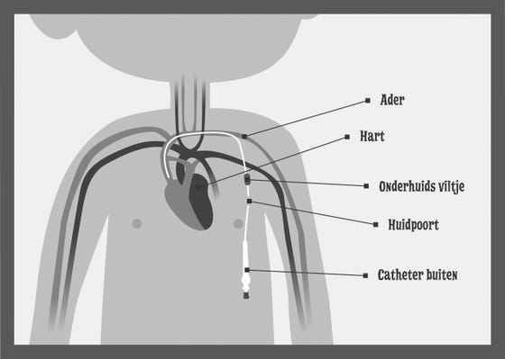 • Je hebt nu een Hickman katheter. Bij het onderste sneetje (de insteekplaats) zie je hem zitten. Bij de huid kan hij vast zitten met een dunne hechting. Die lost vanzelf op.