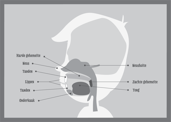 - Het zachte gehemelte: dat zit meer achterin je mond. Hier zit geen harde laag onder. Het zachte gehemelte is belangrijk om te slikken en te praten.