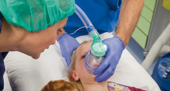 De slaapdokter staat bij het hoofdeind en houdt het kapje vast. Je ademt rustig door je mond totdat je in slaap valt. Je ouder blijft bij je tot je slaapt. Afleiding helpt!