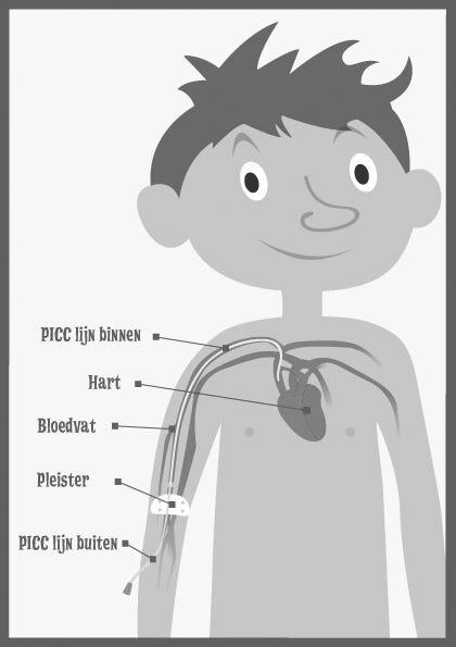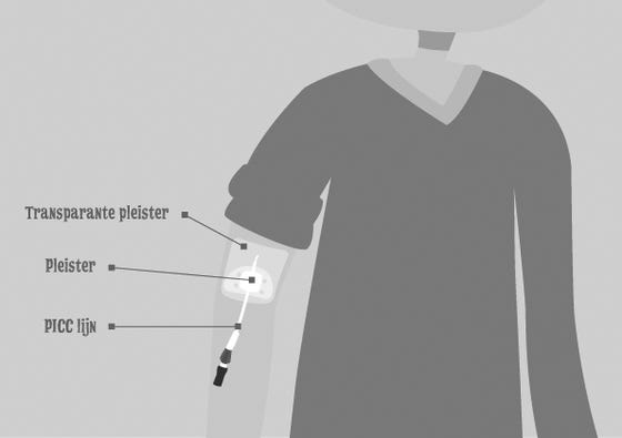 Je krijgt in ons ziekenhuis een PICC lijn. Een PICC lijn is een soepel slangetje dat we in een groot bloedvat brengen. Medicijnen, vocht of voeding kunnen dan door dat slangetje direct in je bloed komen. Een soort infuus dus.