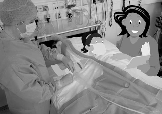 • We leggen een steriele doek over je heen. Op de plek waar de PICC lijn komt, bij je arm, zit een gat in de doek. De doek ligt ook even een beetje over je gezicht heen. Al snel verschuiven we de doek zodat je gezicht weer vrij is. Je kunt zelf niet veel zien van wat er gebeurt.