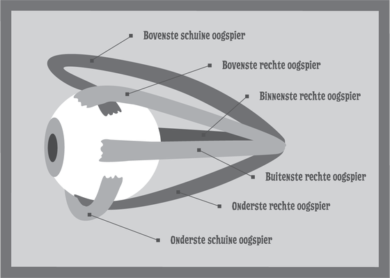 De oogspieren zitten met één uiteinde vast achter in de oogkas en met het andere uiteinde aan de buitenkant van de oogbol. Er zijn vier rechte oogspieren, die boven, onder en aan de twee zijkanten van het oog zitten. Hiermee kan het oog naar boven, onderen en opzij worden gedraaid. Ook zijn er twee schuine oogspieren, die zorgen voor het schuin naar boven en beneden kijken.