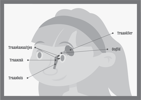 Het traanvocht gaat via de traanbuis naar je neusholte. De traankanaaltjes zitten aan de kant van je neus in allebei je oogleden. Als je huilt, komt er extra traanvocht. Dat extra vocht zoekt een uitweg. Het rolt als tranen uit je ogen.