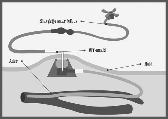 • Meestal halen we de VIT-naald er uit voordat je naar huis gaat. Alleen als je VIT elke dag gebruikt wordt en je tussendoor naar huis gaat, mag de naald blijven zitten. De dokter overlegt dit met jou en je ouders.