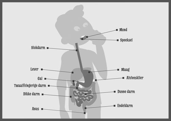 In je lichaam maken de organen van het spijsverteringskanaal het voedsel klein. Al deze organen werken samen. Zo maakt het eten een reis door je lichaam. Het begint als je eten in je mond stopt. Het eindigt als je gepoept hebt. Van boven naar beneden dus!
