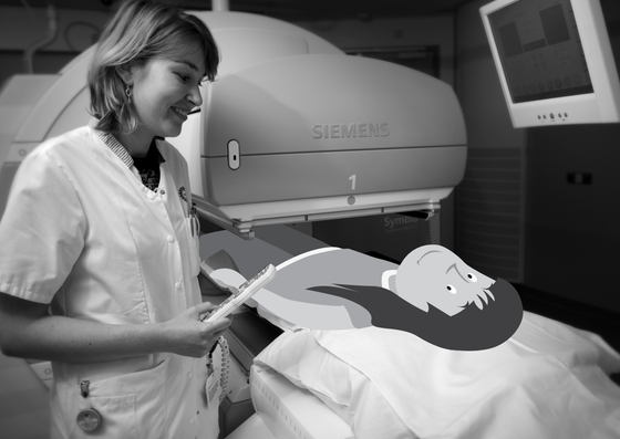 - Een laborant maakt de foto’s. Hij blijft in de behandelkamer en je kan gewoon met elkaar praten. Achter een glazen wand, zit de medisch nucleair werk(st)er.