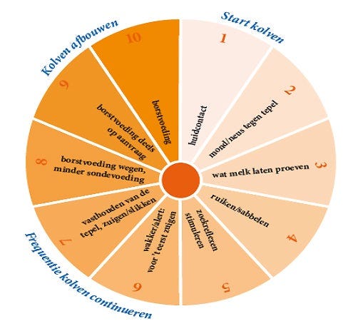 Baby’s kunnen in deze fase nog snel moe zijn en moeite hebben om de borst vast te houden omdat de conditie nog laag is en moeder niet altijd aanwezig kan zijn. De baby wordt voor en na de voeding gewogen.