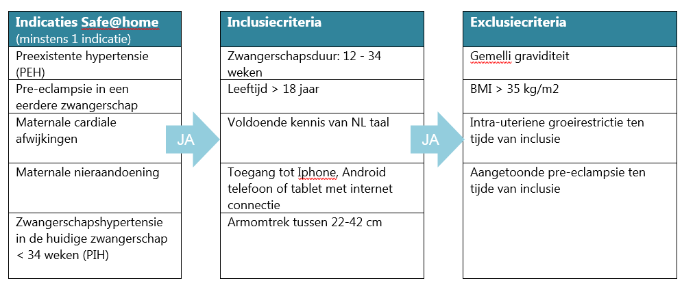 Onderzoekspopulatie: in totaal zullen 750 zwangeren vrouwen gebruik maken van het SAFE@Home platform. Inclusiecriteria zijn: voorgeschiedenis met pre-eclampsie, chronische hypertensie, hart-aandoeningen, nier-aandoeningen en zwangerschapshypertensie in de huidige graviditeit. Bekijk hier de volledige in- en exclusiecriteria van SAFE@HOME II studie. Daarnaast bevragen we professionals die betrokken zij bij SAFE@Home.