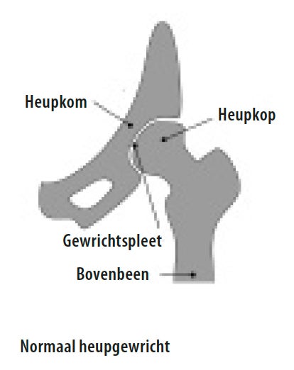 Het heupgewricht bestaat uit een heupkop en een heupkom. Een goed ontwikkeld heupgewricht heeft een ronde; diepe kom, die de kop van de heup goed omsluit.