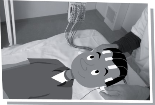 Tijdens een EEG meten we jouw hersenactiviteit. Dat kun je zien op een beeldscherm. Bij het onderzoek gebruiken we elektroden en een EEG-apparaat. Een elektrode is een metalen dopje met een draad eraan. Dit is verbonden met het EEG-apparaat, dat is een soort computer. Deze elektroden zijn even een soort boodschappers of internetkabeltjes. Ze geven aan de computer door wat er in jouw hersenen gebeurt.
