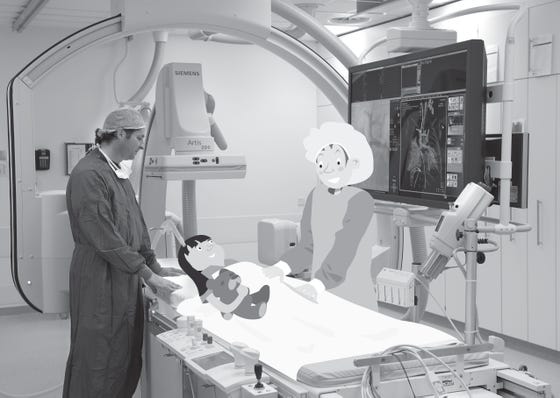 In de HC-kamer zie je veel apparatuur en een smal bed op één poot. We noemen dit de onderzoekstafel. Boven de onderzoekstafel hangt een grote lamp. Over de tafel heen hangt een groot röntgenapparaat. De dokters en verpleegkundigen dragen speciale, groene pakken en een muts.