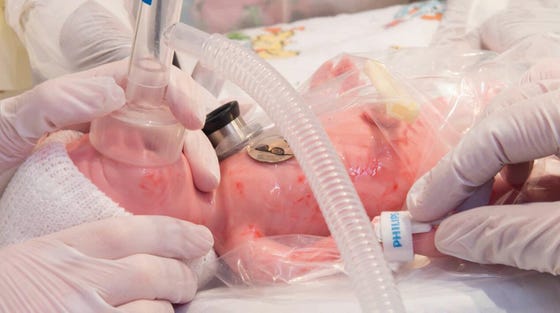 Bij de geboorte staan er meerdere zorgverleners klaar om uw kind op te vangen. Uw kind kan maar heel kort, of zelfs helemaal niet, bij u liggen omdat er hulp gegeven moet worden bij de ademhaling. Een verpleegkundige loopt met uw kind naar de opvangkamer naar het team dat daar staat te wachten. Een partner of andere naaste, indien aanwezig, kan mee. Uw kind krijgt een muts op en zit met het hele lijfje in een plastic zak om warm te blijven.