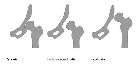 In het geval van heupdysplasie is de heupkom ondiep. Dit kan zo ondiep zijn dat de heupkop zich kan verplaatsen in de kom (subluxatie) of in zijn geheel uit de kom staat. (heupluxatie).