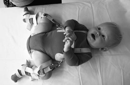 De Pavlik bandage voorkomt het strekken en stimuleert het spreiden van de heupen.