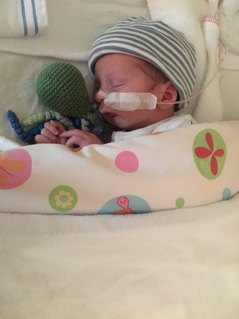 Quint werd met een keizersnede geboren. Voor de zekerheid stond een extra OK voor hem klaar. Deze bleek niet nodig. Na een paar dagen op de kinder IC en mediumcare te hebben gelegen, is Quint op een reguliere verpleegafdeling verzorgd. Twee weken na zijn geboorte mocht hij mee naar huis. Nog wel met een voedingsonde, een neusbuisje om een vrije ademweg te garanderen en een monitor om het zuurstofgehalte in het bloed te bewaken.
